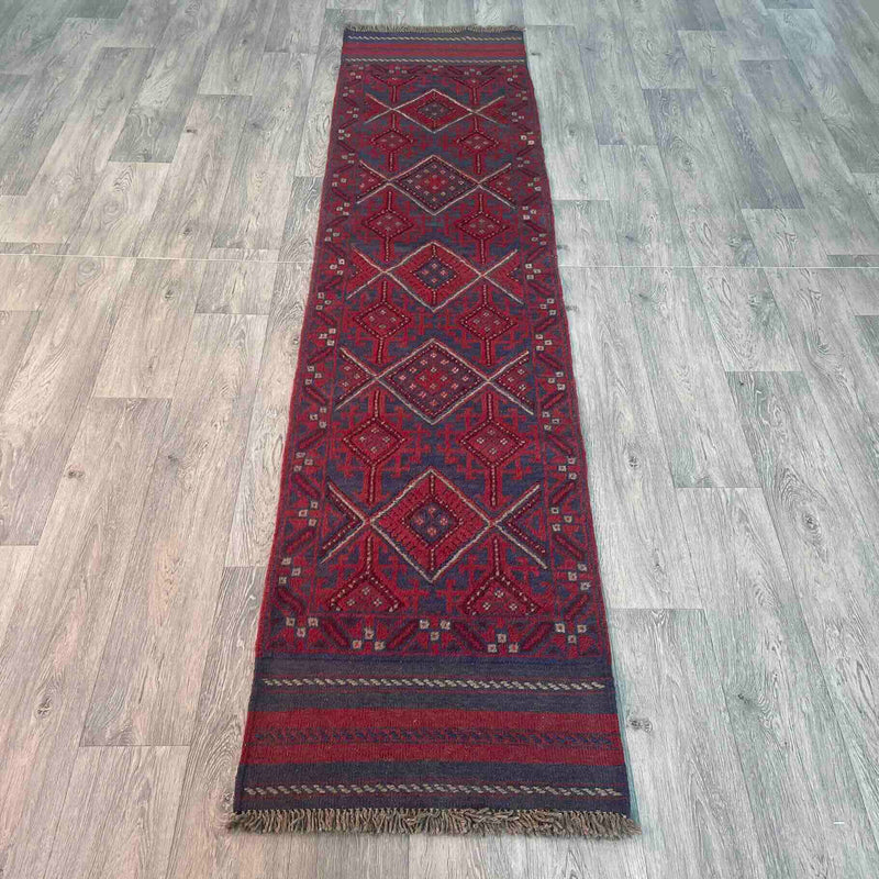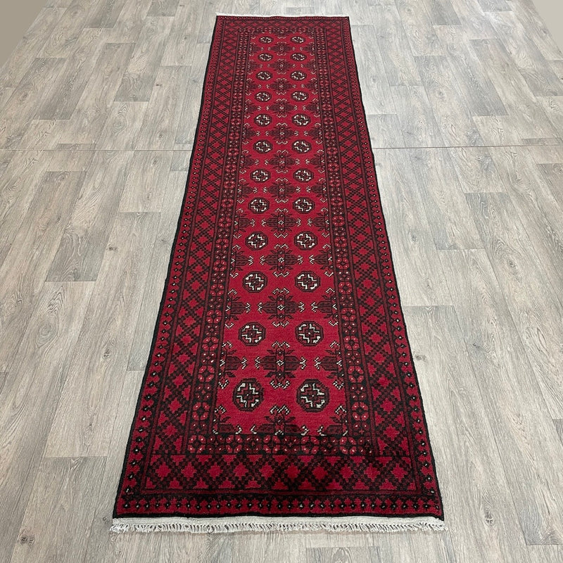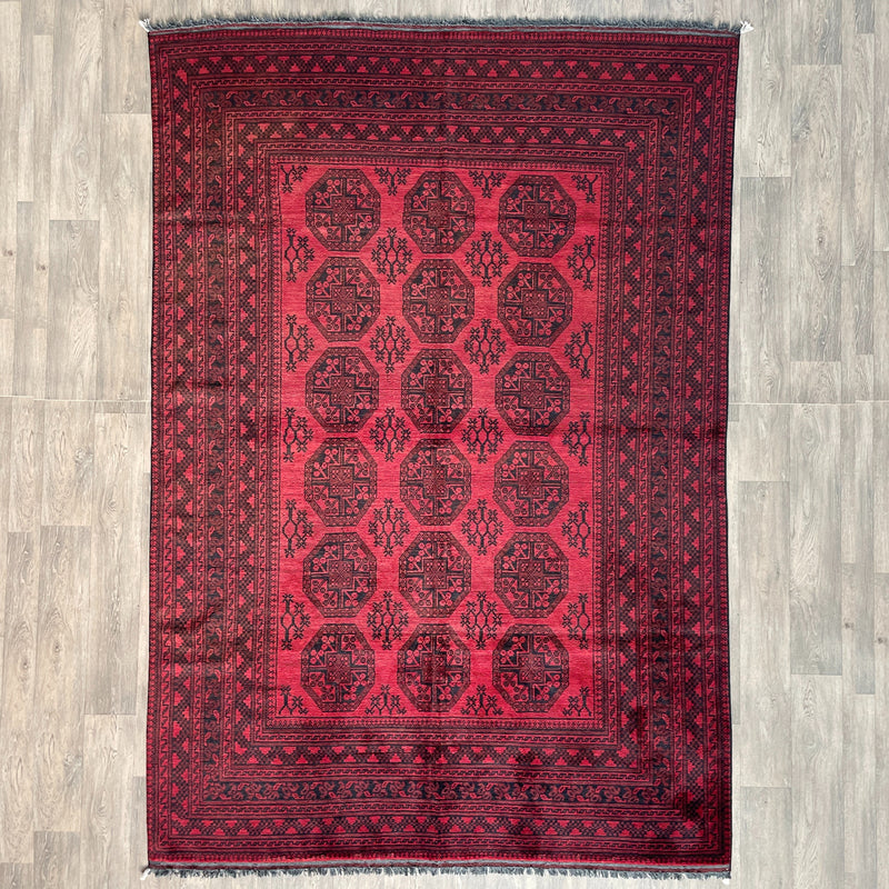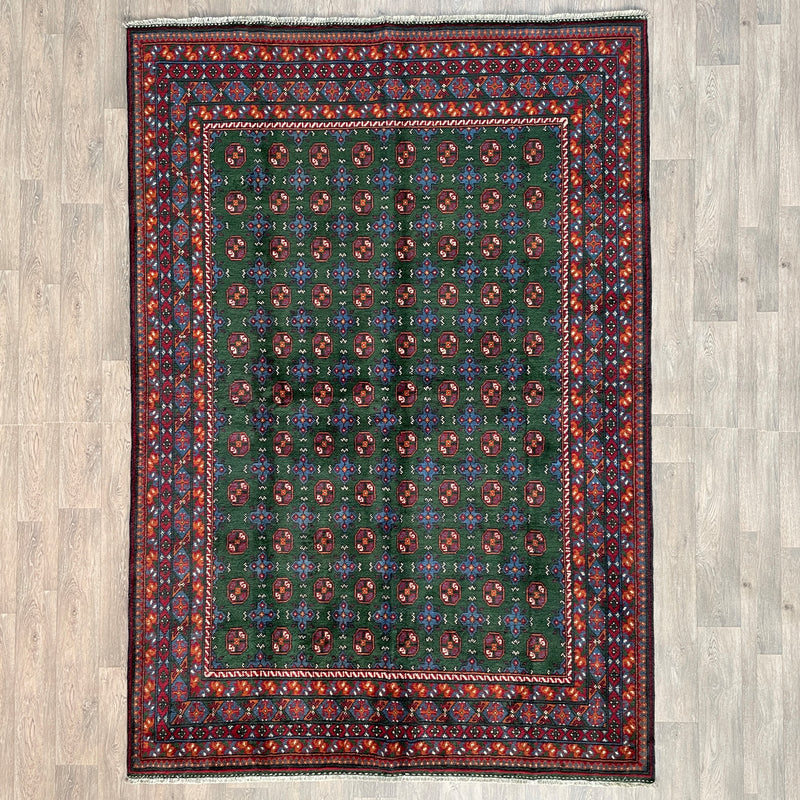 Mushwani rugs are often compared to other Afghan tribal weavings, such as Baluch or Turkmen rugs, yet they remain distinct. While Baluch rugs tend to feature finer patterns and greater intricacy, Mushwani rugs are more structured and expansive in their designs. Unlike Turkmen rugs, which rely heavily on formalized gul patterns and rich reds, Mushwani rugs favour darker tones and freer, less standardized geometry.